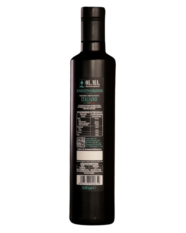 Olio extra vergine di oliva Italiano Monocultivar Frantoio in bottiglia Dorica nero vernice formato 500 ml , confezione con tappo anti riempimento.